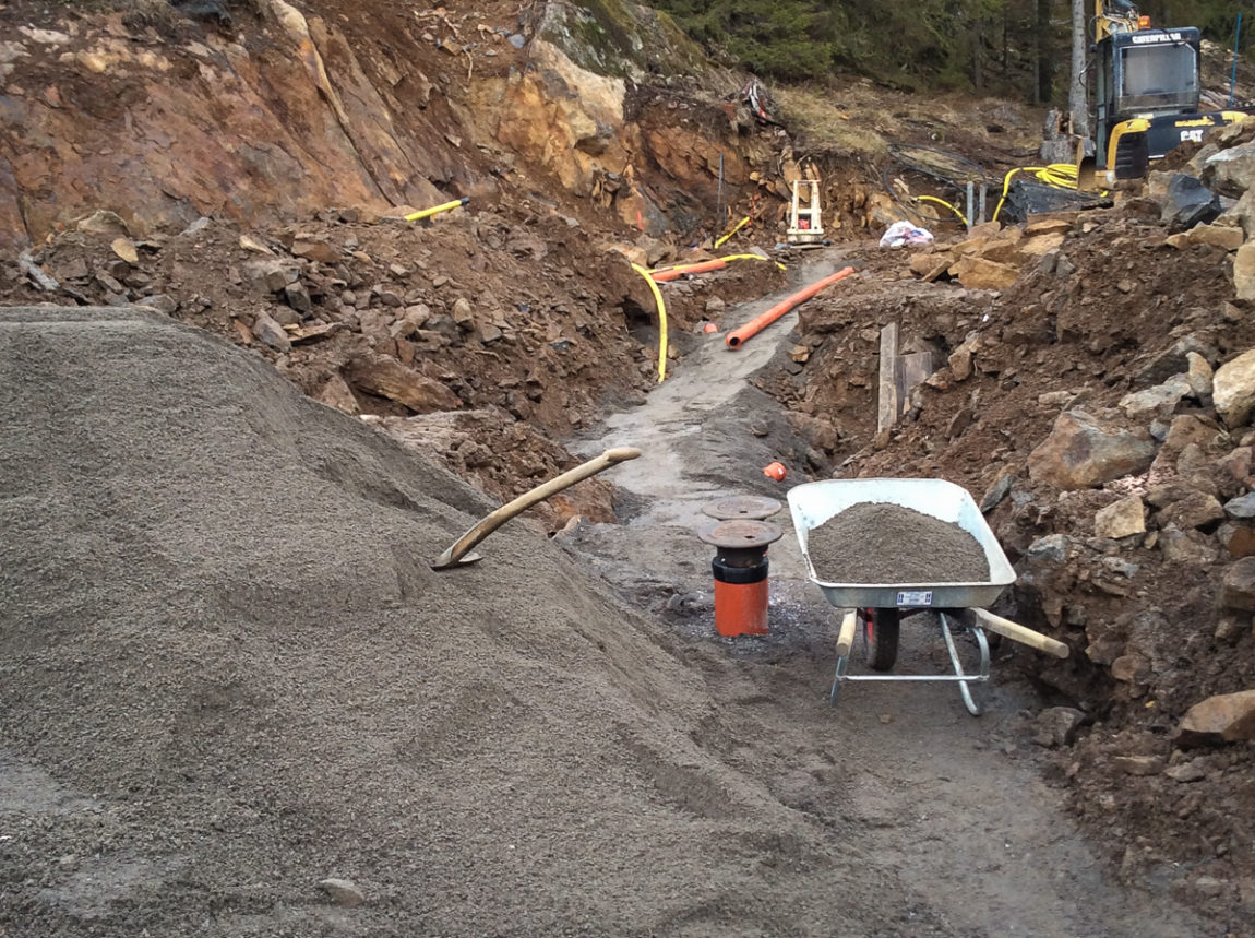 Här bäddas rören in med stenkross för att vi sedan kan återfylla.